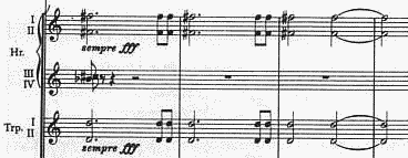トランペットとホルンが、高らかに運命動機を奏する箇所(436小節〜)
